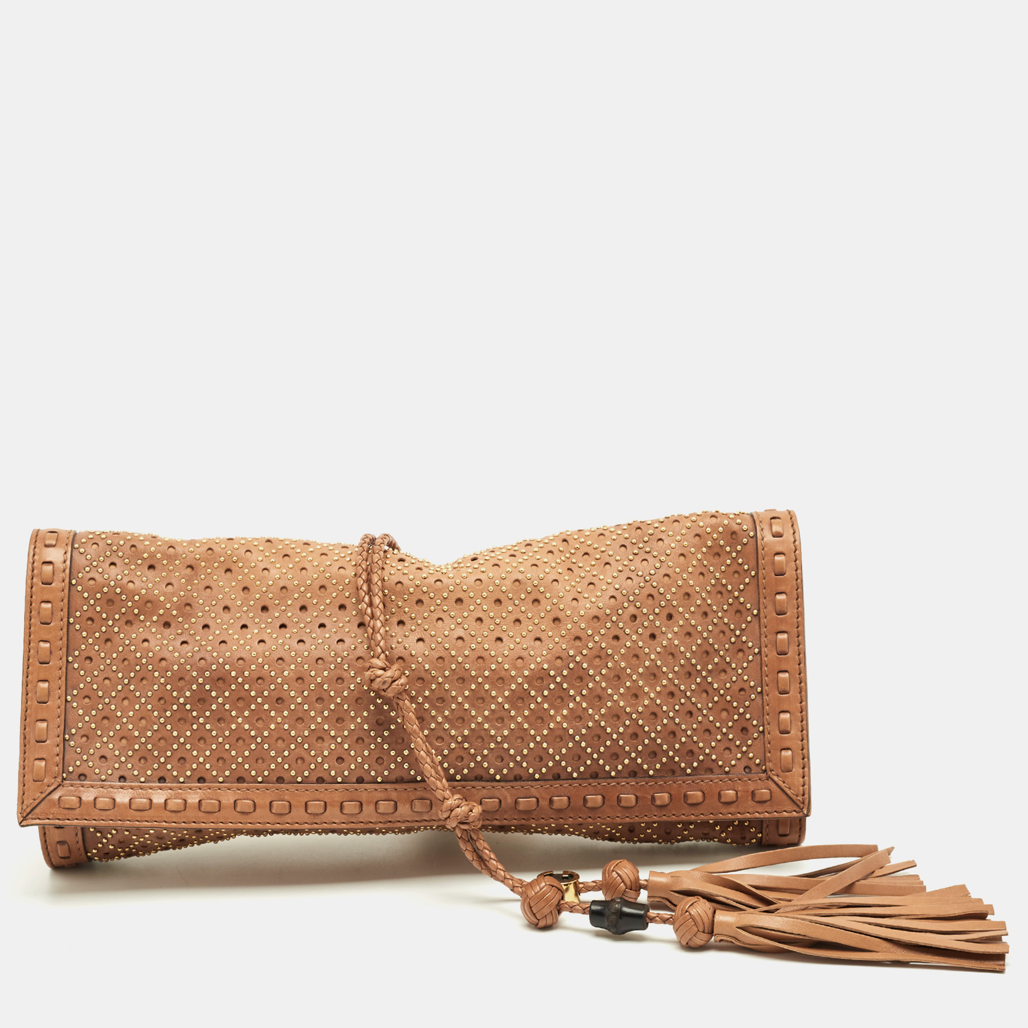 Gucci Brown Perforated Leather Malika Studded Clutch