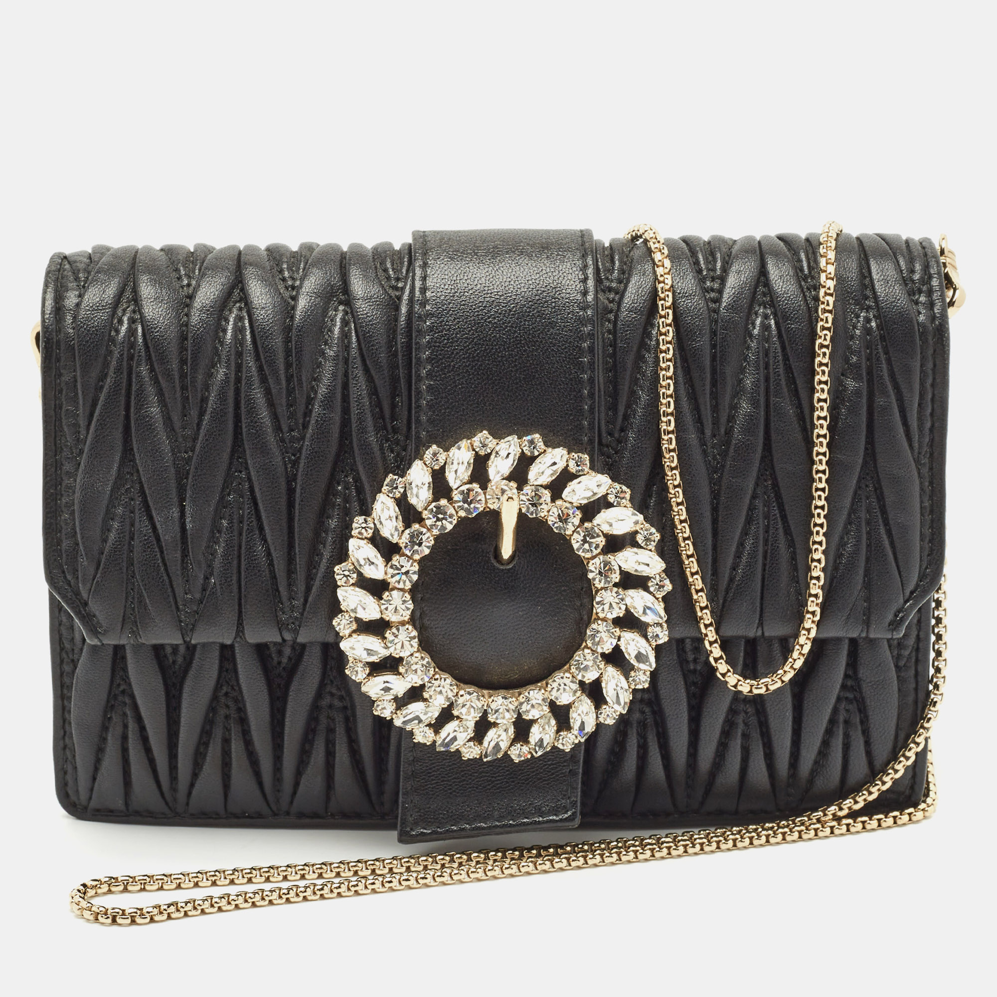 Miu Miu Black Matelassé Leather Crystals Buckle Chain Clutch