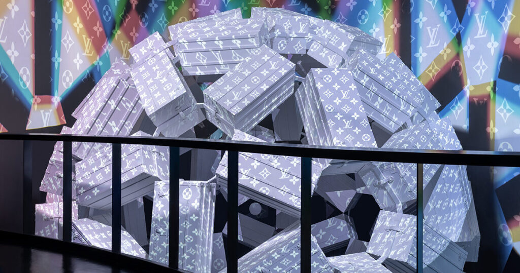 the pavilion presents a glowing library of stacked LV trunks crammed with artisan tales