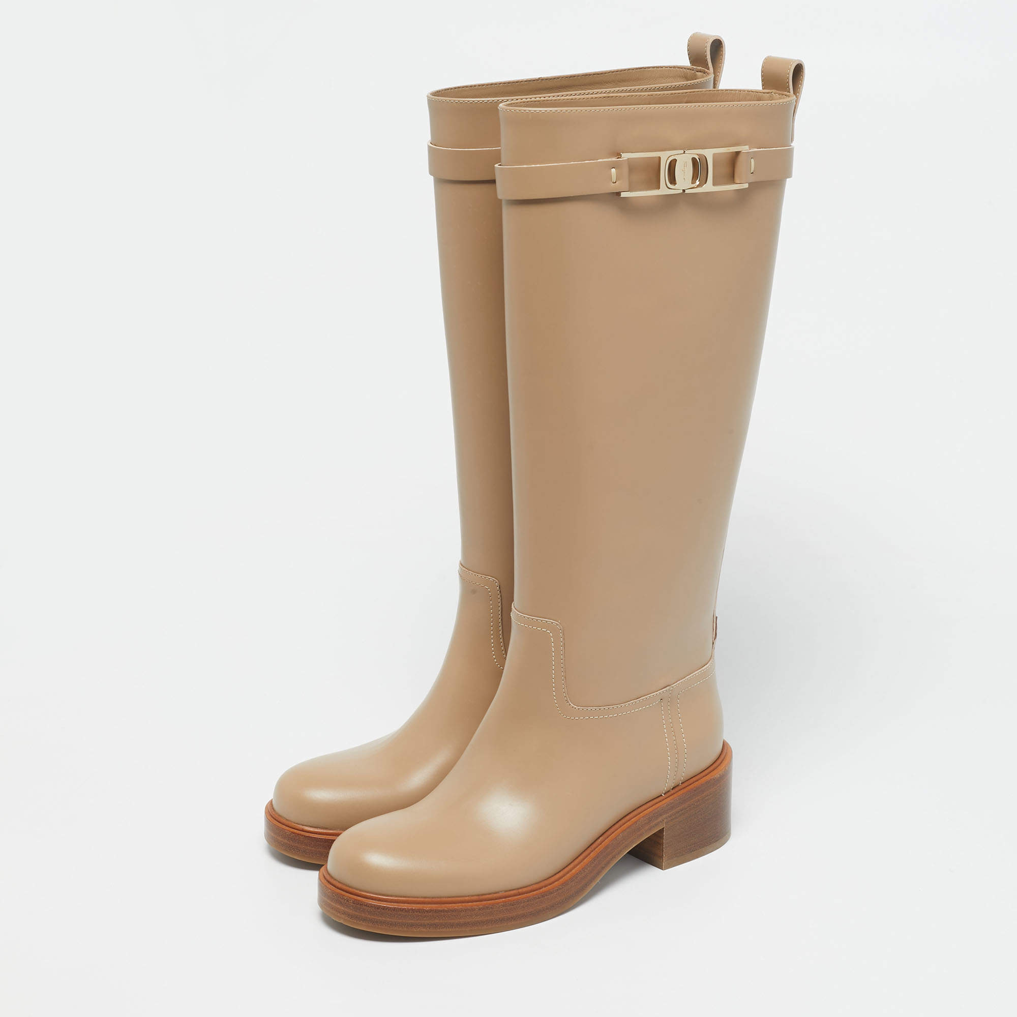 👢 Salvatore Ferragamo Beige Leather Ornament Square Gancini Knee-Length Boots (Size 37.5)